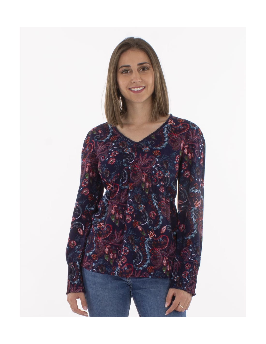 Confectionnée dans un tissu léger et agréable à porter, cette blouse à manches longues offre un excellent confort tout au long de la journée. Son imprimé cachemire raffiné, mêlant des nuances profondes et harmonieuses, apporte du caractère à votre tenue tout en restant facile à assortir.