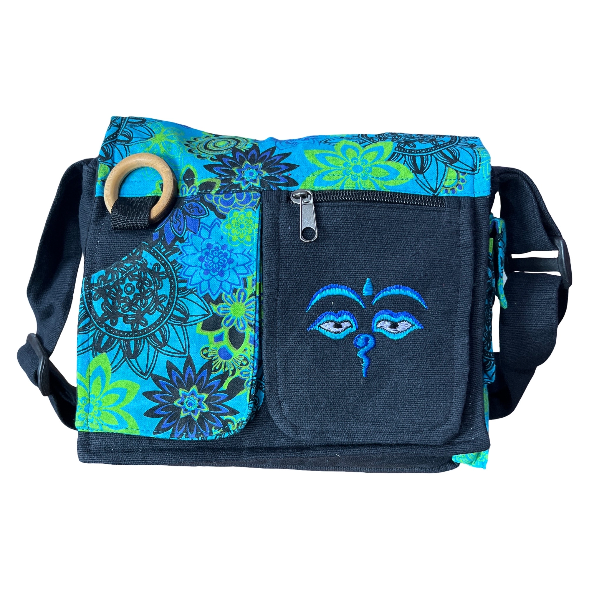 Motifs : imprimés floraux mandala et broderie du symbole Yeux de Bouddha, emblème de sagesse et de protection