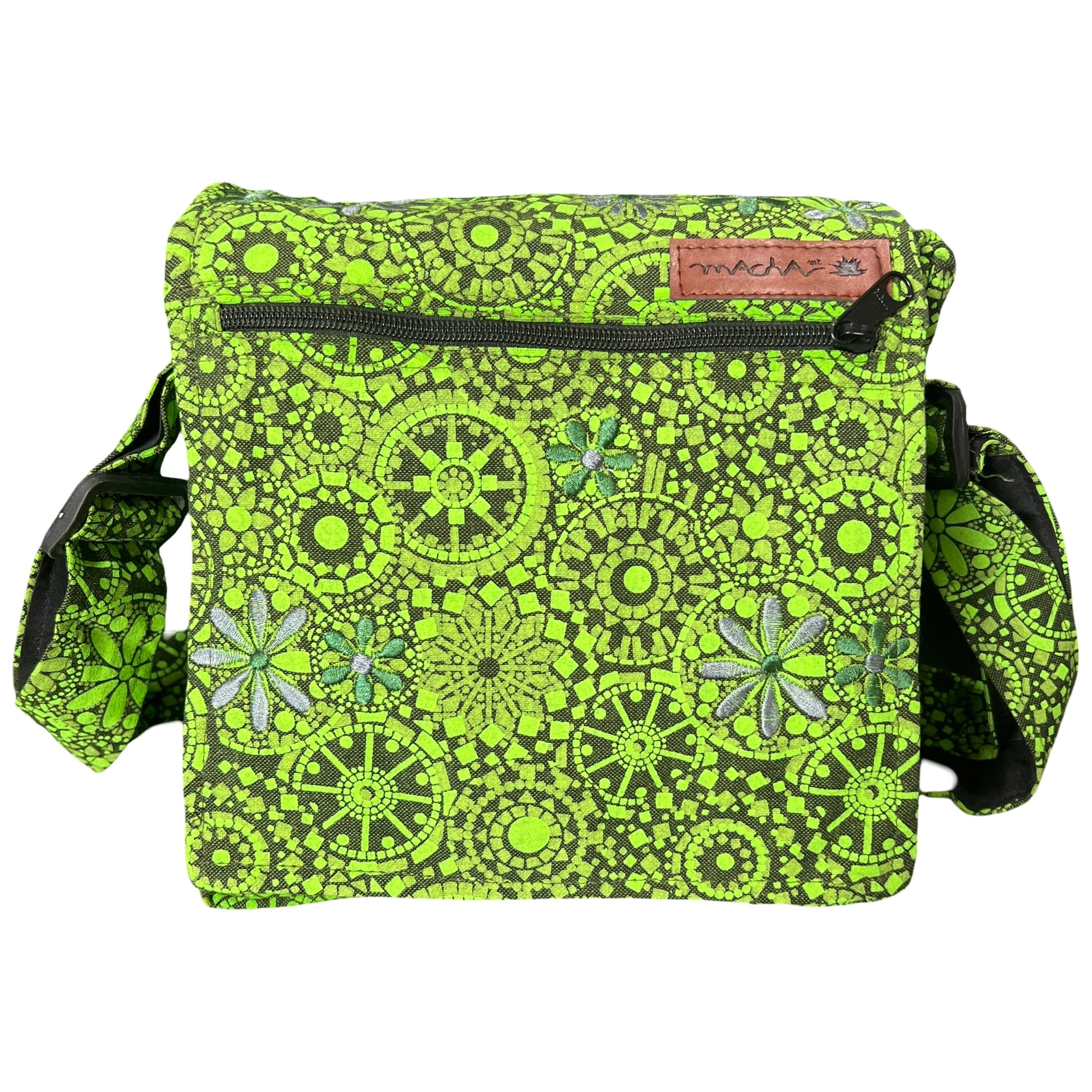 Ce sac bandoulière artisanal et écologique allie style et praticité. Son motif mosaïque vert et noir, inspiré de fleurs et mandalas, en fait un accessoire unique et tendance.